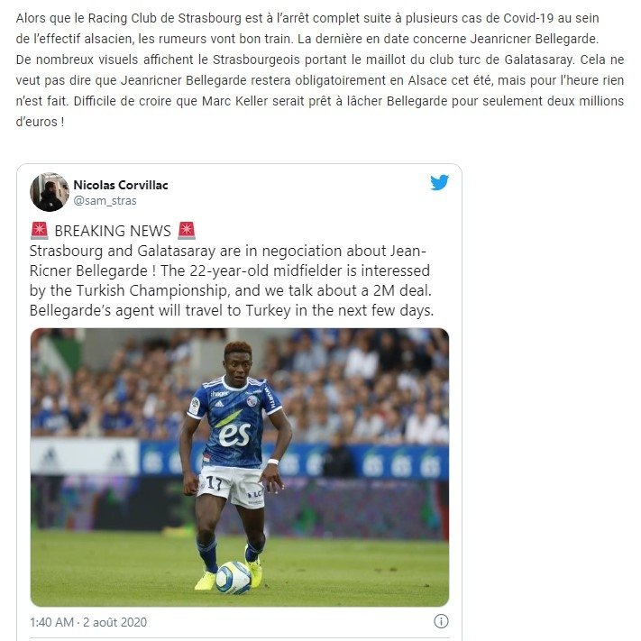 Fransız basınında husus ile ilgili yer alan haberde Galatasaray, Jean-Ricner Bellegarde’nin grubu Strazburg ile transfer görüşmelerini hızlandırdı ve ayrıntıları konuşmaya başladı.