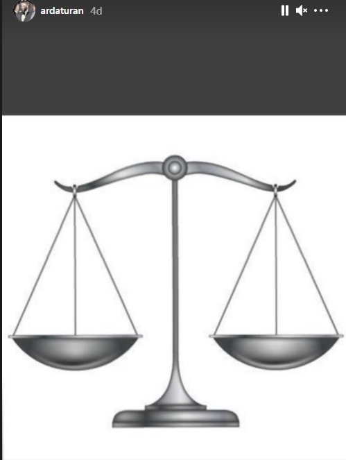 Spor Toto Harika Lig takımlarından Galatasaray forması giyen Arda Turan, teknik yönetici Fatih Terim’e PFDK tarafından verilen 2 maçlık cezayı protesto etmek için şahsî toplumsal medya hesabından ‘adalet terazisi’ paylaştı.