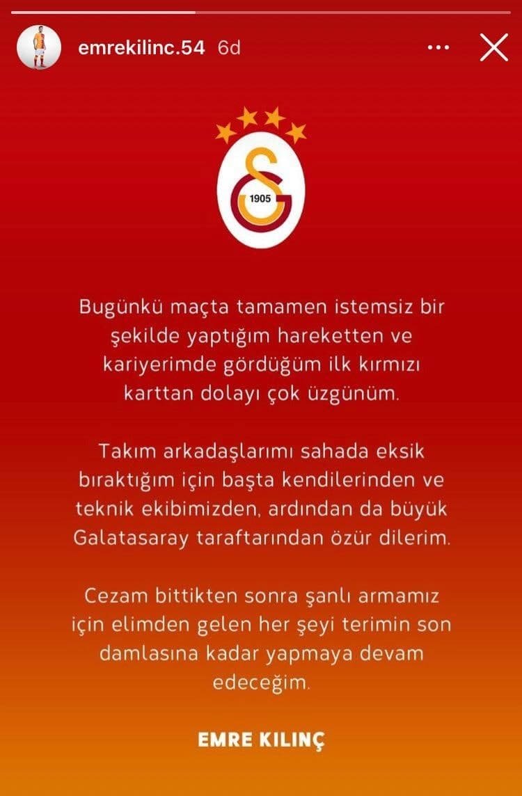 Emre Kılınç, toplumsal medya hesabından yaptığı açıklamada, “Bugünkü maçta büsbütün istemsiz bir halde yaptığım hareketten ve mesleğimde gördüğüm birinci kırmızı karttan ötürü çok üzgünüm. Kadro arkadaşlarımı alanda eksik bıraktığım için başta kendilerinden ve teknik grubumuzdan, akabinde da büyük Galatasaray taraftarından özür dilerim.” sözlerine yer verdi.