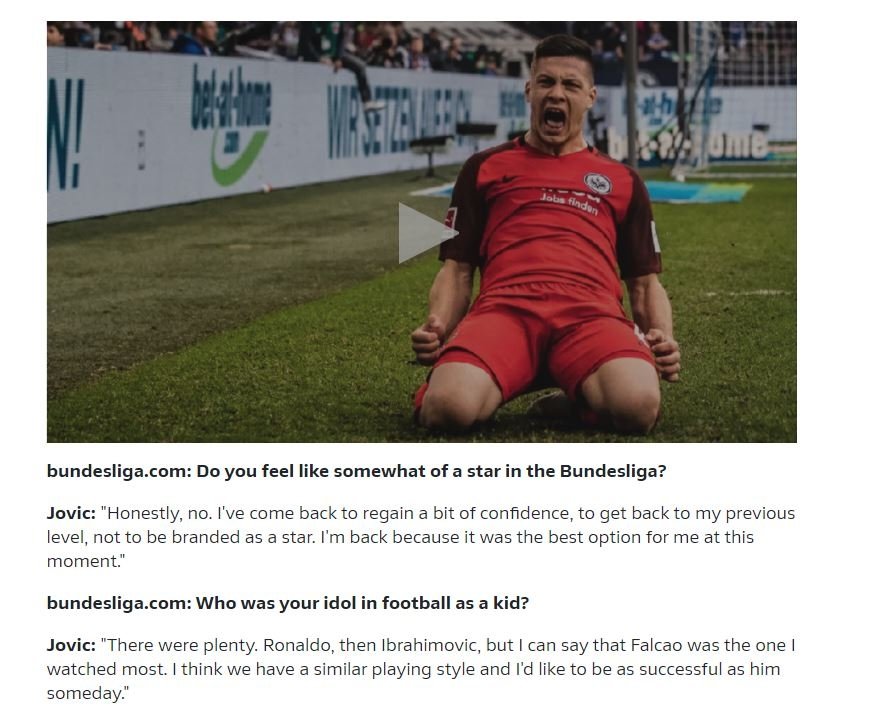 İspanya La Liga devi Real Madrid’in ocak ayı transfer periyodunda Eintracht Frankfurt’a kiraladığı Luka Jovic, Almanya Bundesliga’nın resmi internet sitesine dikkat çeken bir röportaj verdi. 23 yaşındaki Sırp santrfor, “Küçükken idolün kimdi?” sorusuna şu karşılığı verdi: