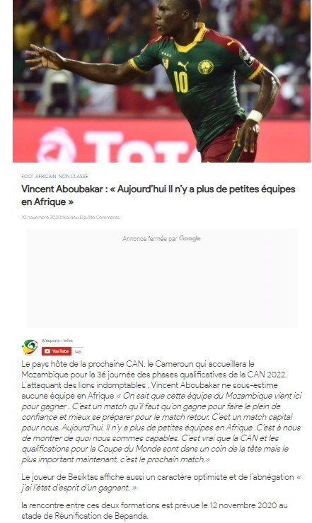 Kamerun Ulusal Kadro kampında bulunan golcü futbolcu, açıklamalarında Afrika futboluna değinirken, “İtimat oluşturmak ve tekrar kendimize gelmek için Mozambik maçını kazanmalıyız. Bizim için çok değerli bir müsabaka. Bugün Afrika’da küçük bir ülke grubu yok, hepsi çok güçlü. Bizim için en kıymetli maç bu.” dedi.
