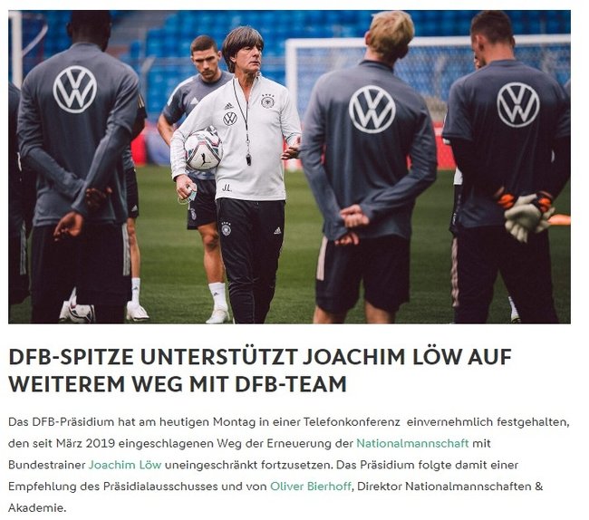 İspanya’ya karşı alınan 6-0’lık yenilginin sebeplerinin bulunacağı ve bu husus üzerine çalışılacağı, Avrupa Şampiyonası’na ekibin kendinden emin bir halde katılacağı söz edildi. Bu sebeple Löw’ün, Almanya Ulusal Kadro başında kalacağı aktarıldı.