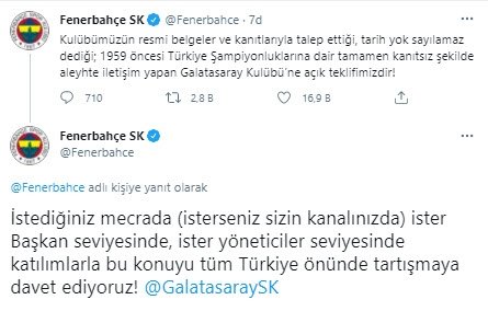 Kulübümüzün resmi dokümanlar ve delilleriyle talep ettiği, tarih yok sayılamaz dediği; 1959 öncesi Türkiye Şampiyonluklarına dair büsbütün ispatsız halde aleyhte irtibat yapan Galatasaray Kulübü’ne açık teklifimizdir!