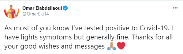 Elabdellaoui, toplumsal medya hesabından yaptığı açıklamada, “Herkesin bildiği üzere korona virüs testim olumlu çıktı. Birtakım semptomlarım var lakin durumum genel olarak iyi. Herkese iyi dilekleri için teşekkürler” sözlerini kullandı.