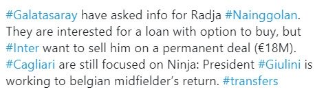 Ünlü İtalyan gazeteci Nicolo Schira’nın toplumsal medya hesabından duyurduğu habere nazaran Galatasaray, Radja Nainggolan’ı satın alma opsiyonuyla kiralamak için Inter’e teklif götürdü. Lakin İtalyan takımının kiralamaya sıcak bakmadığı, direkt satış düşündüğü ve 18 milyon euroluk bir bedel belirlediği tabir edildi.