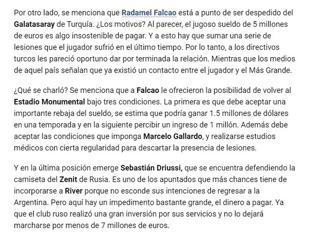 Şu anda Galatasaray’dan 5 milyon euro kazanan Falcao’dan maaşında indirim istendi. River Plate Falcao’ya birinci dönem için 1.5 milyon dolar, 2. dönem 1 milyon dolar verebileceğini aktardı.