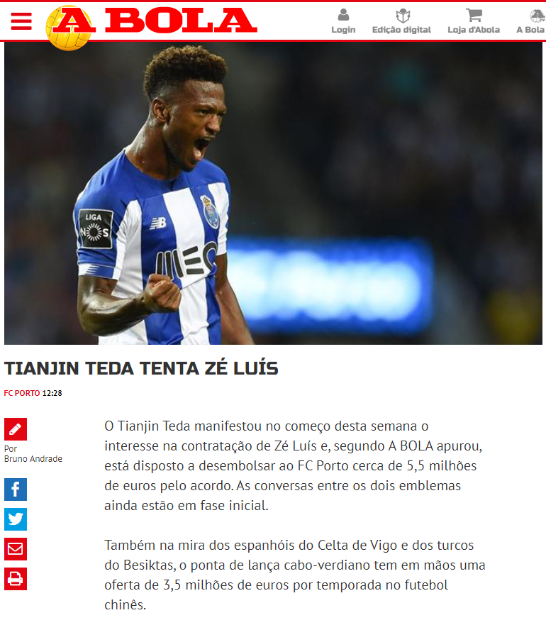 Portekiz basının haberine nazaran Çin Ligi gruplarından Tianjin Teda, Ze Luis’e yıllık 3.5 milyon euro, Porto’ya ise bonservis için 5.5 milyon euro teklif etti.