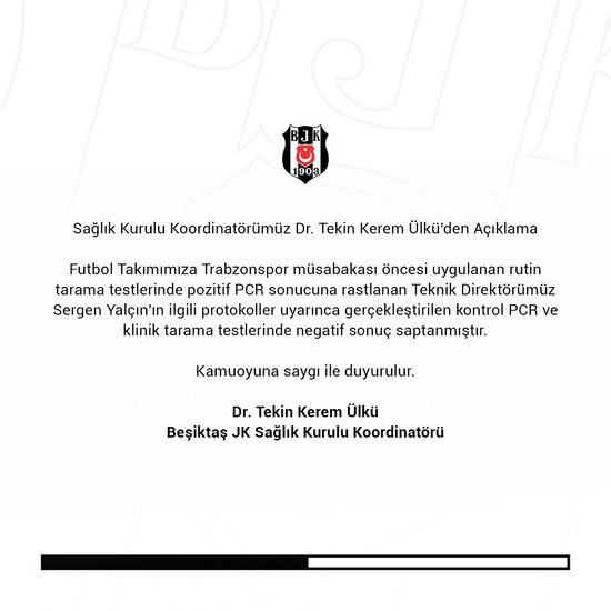 Sergen Yalçın’dan Beşiktaş’a müjdeli haber geldi. Siyah-beyazlılar, başarılı teknik adamın son corona virüsü test sonucunun negatif çıktığını açıkladı.