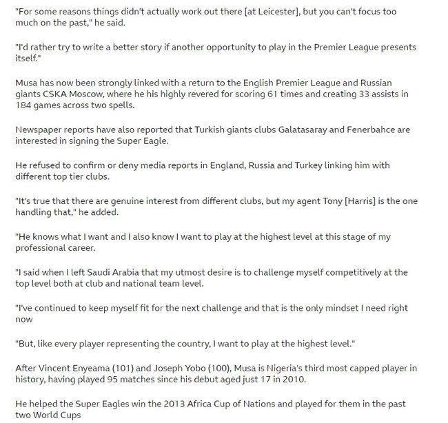 BBC’nin haberine nazaran Ahmed Musa’nın bir sonraki durağı büyük ihtimalle Sheffield United olacak lakin Nijeryalı yıldız, kendisine gelen öbür teklifleri de değerlendirdiğini itiraf etti.