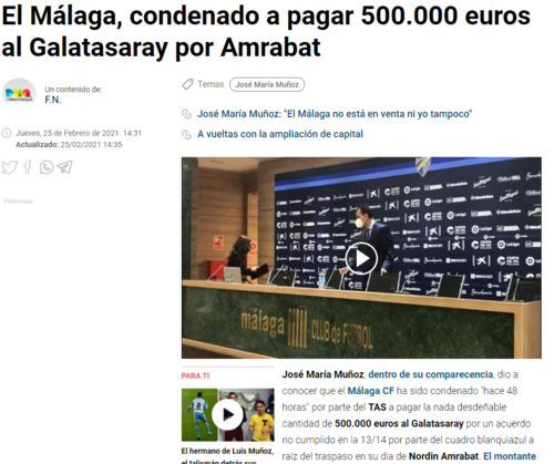 İspanya 2. lig gruplarından Malaga’nın Lideri Jose Maria Munoz, Memleketler arası Spor Tahkim Mahkemesi (CAS)’ın Galatasaray’a 500 bin euro ödemeleri tarafında karar verdiğini açıkladı.