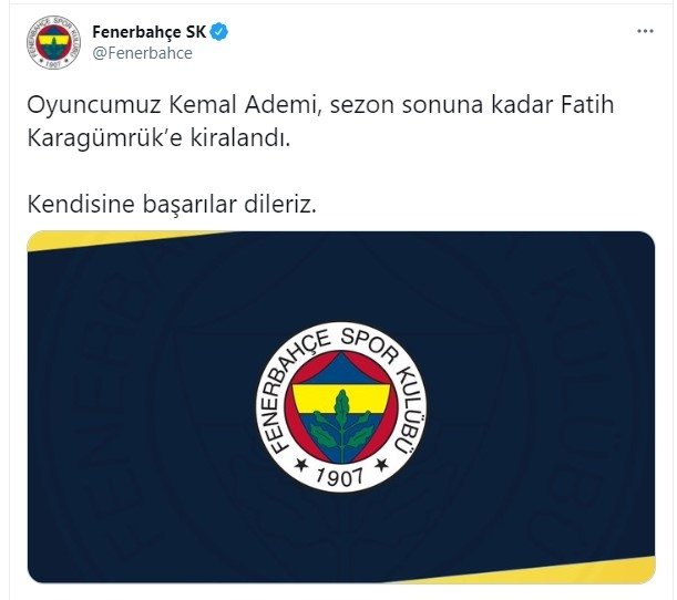 Sarı lacivertlilerden yapılan açıklamada, “Oyuncumuz Kemal Ademi, dönem sonuna kadar Fatih Karagümrük’e kiralandı. Kendisine muvaffakiyetler dileriz.” tabirlerine yer verildi.