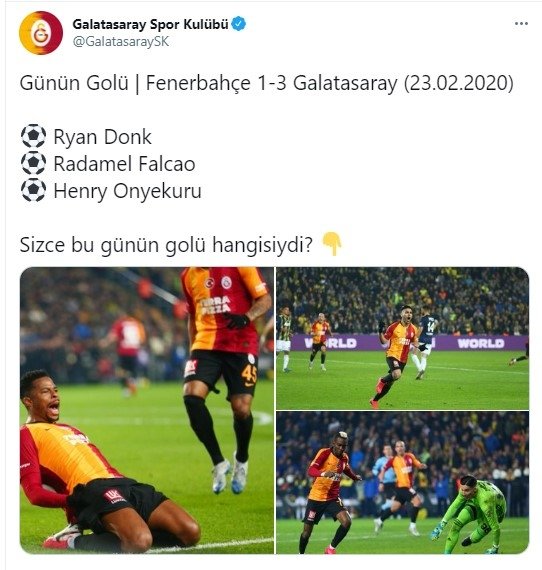 Ortadan tam 1 yıl geçti. Galatasaray bugün (23 Şubat 2021) tarihinde toplumsal medyadan paylaşım yaptı. Kelam konusu paylaşımda Ryan Donk, Radamel Falcao ve Henry Onyekuru’nun gol sevinçlerine yer verilirken, ‘Sizce bu günün golü hangisiydi?’ sorusu soruldu. Bu paylaşım kısa müddette binlerce paylaşım ve etkileşim aldı.