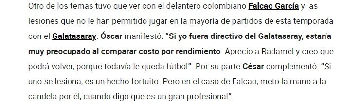 Ünlü yorumcu, Kolombiya’da yayınlanan Futbol Darbesi programında, “Galatasaray’da yönetici olsaydım, Falcao’nun performans ve maliyetini düşündüğümde endişelenirdim. Radamel’i de takdir ediyorum. Şu an bir sakatlık yaşıyor ve geri dönebileceğini düşünüyorum. Zira futbolu yarım kaldı. Şayet bir futbolcu sakatlanırsa, elinde olmayan sebeplerden ötürü olursa bu tesadüf ve şanssızlıktır. Falcao için de bunu söyleyebiliriz. Fakat yaşadıklarına bakıldığında şu anda işlerin biraz karışık olduğunu da söyleyebilirim.” dedi.