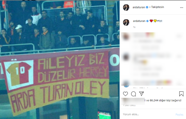 Galatasaraylı futbolcu Arda Turan, toplumsal medya hesabından sarı-kırmızılılar için paylaşımda bulundu.