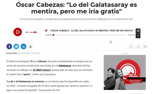 El VBAR Caracol’a açıklamalarda bulunan genç oyuncu, kendisine yöneltilen Galatasaray ve transfer sorusunu yanıtlarken, sarı kırmızılıların şimdi resmi bir teklif getirmediğini ve haberlerin gerçek olmadığını lisana getirdi.