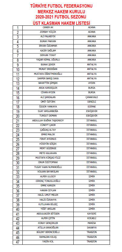 Türkiye Futbol Federasyonu Merkez Hakem Şurası, 2020-2021 döneminde misyon yapacak üst klasman hakem listesini açıkladı.