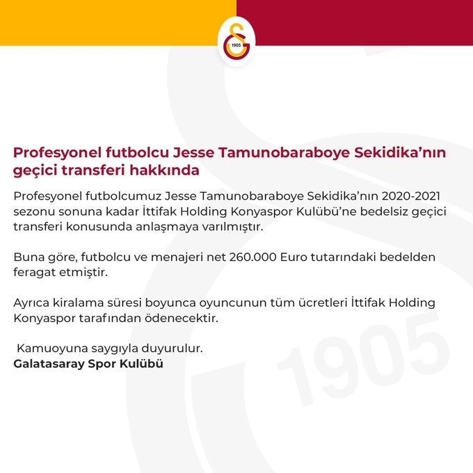 Sarı-kırmızılı kulüpten yapılan açıklamada, “Profesyonel futbolcumuz Jesse Tamunobaraboye Sekidika’nın 2020-2021 dönemi sonuna kadar İttifak Holding Konyaspor Kulübü’ne bedelsiz süreksiz transferi konusunda muahedeye varılmıştır” denildi.
