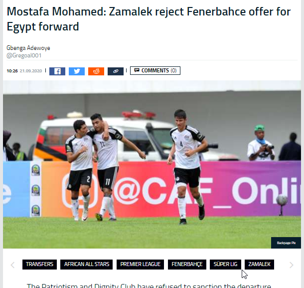 Kısa müddet içerisinde Avrupa’dan değerli golcüyü takımına dahil edeceği söz edilen Fenerbahçe’nin, Mısır grubu Zamalek’te forma giyen Mostafa Mohamed için de resmi transfer teklifinde bulnuduğu ortaya çıktı.