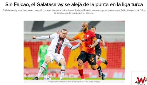 Falcao’nun maçı kenardan izlediğini ve grup arkadaşlarına yardımcı olamadığını belirten wradio.com isimli internet sitesi ise “Falcao’suz Galatasaray Türkiye liginde tepeden uzaklaşıyor” tabirini kullandı.