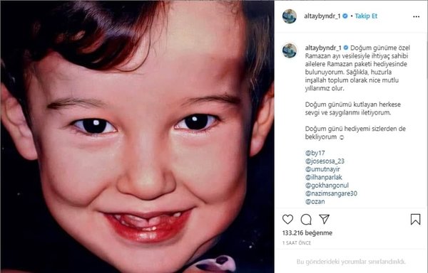 Bugün 23. yaş gününü kutlayan Fenerbahçe’nin ulusal yıldızı Altay Bayındır, toplumsal medya hesabından yaptığı paylaşımla futbolcu arkadaşlarına Ramazan ayında gereksinim sahiplerine yardım davetinde bulundu. Altay, “Doğum günüme özel Ramazan ayı vesilesiyle gereksinim sahibi ailelere Ramazan paketi ikramında bulunuyorum. Sıhhatle, huzurla inşallah toplum olarak birçok memnun yıllarımız olur” dedi. Altay’ın başlattığı bu yardım kampanyasına, Burak Yılmaz, Sosa, Umut Nayir, İlhan Parlak, Gökhan Gönül, Nazım Sangare, Ozan Tufan, Harun Tekin, İrfan Can Kahveci, Caner Erkin, Mert Hakan Yandaş ve Sinan Gümüş’ü de davet etti.