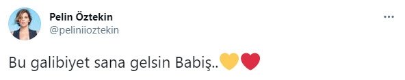Babasını kaybettikten sonra birinci defa paylaşım yapan Pelin Öztekin, “Bu galibiyet sana gelsin Babiş..” formunda bir tweet atarken, paylaşımına sarı-kırmızılı kalp de koydu.