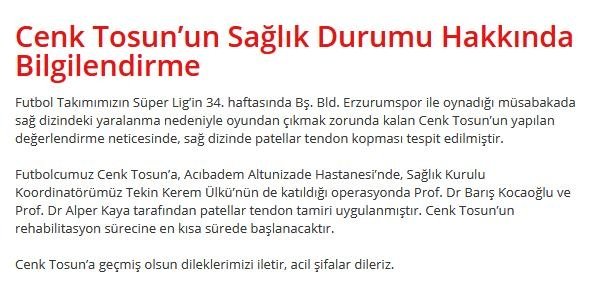 “Futbol Kadromuzun Üstün Lig’in 34. haftasında Bş. Bld. Erzurumspor ile oynadığı karşılaşmada sağ dizindeki yaralanma nedeniyle oyundan çıkmak zorunda kalan Cenk Tosun’un yapılan kıymetlendirme sonucunda, sağ dizinde patellar tendon kopması tespit edilmiştir.