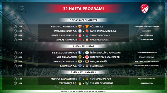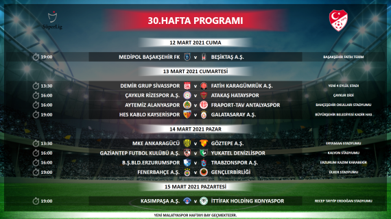 Spor Toto Muhteşem Lig’de 30, 31, 32, 33 ve 34. haftanın maç programı açıklandı. TFF’nin resmi sitesinden paylaşılan programa nazaran; Beşiktaş ile Fenerbahçe ortasında 31. haftada oynanacak olan dev derbi 21 Mart Pazar günü saat 19.00’da başlayacak.