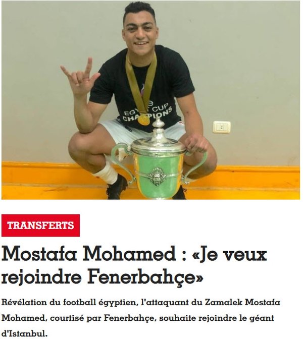 France Football’a konuşan genç golcü, Fenerbahçe’nin kendisi için Zamalek’e 2.5 milyon euroluk teklif yaptığının söylenmesi üzerine, “Evet, yanlışsız. Fenerbahçe beni istiyor. Bu büyük kulübe katılmak istiyorum. Neredeyse 23 yaşındayım ve benim için bir adım atarak Avrupa’ya gitme vakti. Mısır’dan ayrılmak istiyorum” dedi.