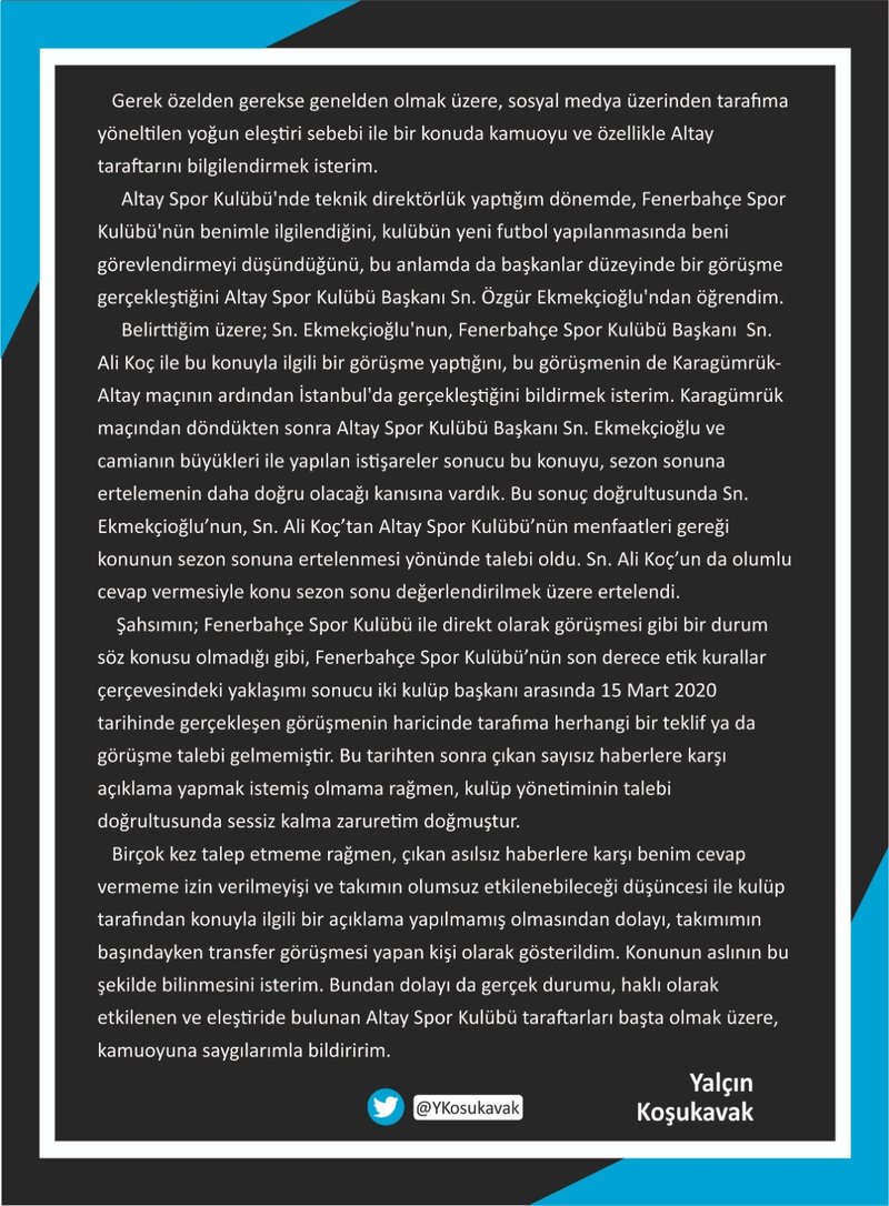 Koşukavak, yaptığı açıklamada, “Fenerbahçe’ye gitmek için kişisel bir görüşme gerçekleştirmedim, 15 Mart’ta iki kulübün lideri görüştü.” dedi.