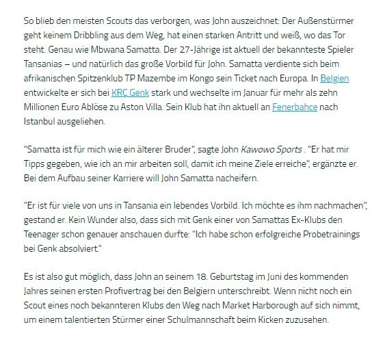 John, konuşmasının devamında, “Tanzanya’daki genç yetenekler için o yaşayan en büyük örnek. Onun üzere olmak istiyorum ve onu taklit ediyorum. Onun üzere Genk’te başarılı bir deneme eğitimine gittim ve tamamladım.” dedi.