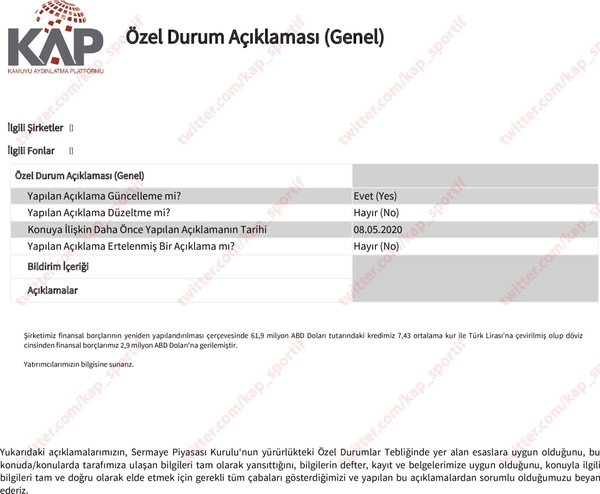 Şirketimiz finansal borçlarının yine yapılandırılması çerçevesinde 61,9 milyon ABD Doları fiyatındaki kredimiz 7,43 ortalama kur ile Türk Lirası’na çevirilmiş olup döviz cinsinden finansal borçlarımız 2,9 milyon ABD Doları’na gerilemiştir.