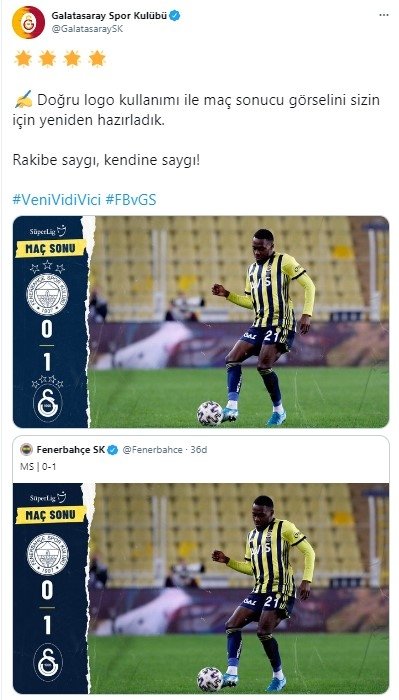 Sarı kırmızılı kulüp, maç sonrası Fenerbahçe’nin toplumsal medya hesabından yapılan paylaşıma karşılık verdi ve 4. yıldız göndermesinde bulundu.