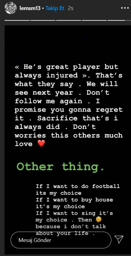 Galatasaray ile kiralık kontratı sona eren Lemina, “İyi futbolcu fakat daima sakatlanıyor. Benim için bunu diyorlar. Gelecek yıl göreceğiz. Beni bir daha takip etmeyin. Size kelam veriyorum pişman olacaksınız. Ben her vakit fedakarlık yapan biriyim. Bunlar için endişelenmeyin. Başkalarına sevgiler.” dedi.